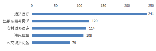 出行类诉求中,市民反映诉求较多的前五类事项分别为:道路通行、出租车服务投诉、农村道路建设、违规停车、公交线路问题,以上五类占出行类总比42.38%。