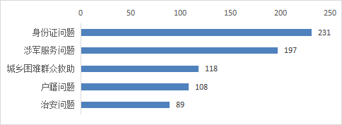 社会治理类诉求中,市民反映诉求较多的前五类事项分别为:身份证问题、涉军服务问题、城乡困难群众救助、户籍问题、治安问题,以上五类占社会治理类总比48.12%。