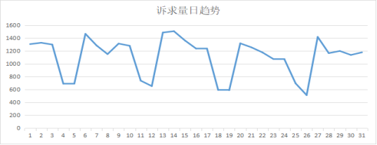 (一)从时间分布看,每逢周六日,诉求量较少,每天总量在500-700件,周一至周五每天在1100-1500件,总体趋势比较平稳。