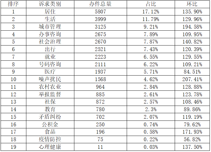 (二)本月诉求按大类统计,群众诉求主要集中在居住、生活、城市管理、办事咨询、社会治理、出行、就业、号码咨询、医疗、噪音扰民,以上十类占总比83.1%。