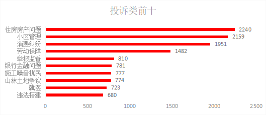 (三)本月群众诉求投诉类问题(中类)主要集中在:住房房产问题、小区管理、消费纠纷、劳动保障、举报监督、银行金融问题、施工噪音扰民、山林土地争议、就医和违法搭建等方面。