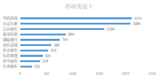 本月群众诉求咨询类问题(中类)主要集中在:号码咨询、办事办证、公共服务、医保政策、道路通行、政务咨询、供水服务、垃圾清理、供气和社保服务。