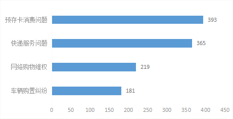 消费纠纷类诉求1951件,占比5.75%,环比增长17.3%。其中预存卡消费问题393件,占比20.14%;快递服务问题365件,占比18.71%;网络购物维权219件,占比11.23%;车辆购置纠纷181件,占比9.28%。