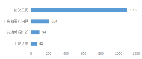 劳动保障类诉求1482件,占比4.37%,环比增长30.7%。其中拖欠工资问题1095件,占比73.89%;工资和福利问题204件,占比13.77%;劳动关系纠纷94件,占比6.34%;工伤认定问题62件,占比4.18%。