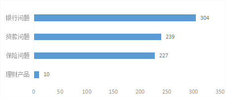 银行金融类诉求781件,占比2.3%,环比增长17.4%。其中银行问题304件,占比38.92%;贷款问题239件,占比30.6%;保险问题227件,占比29.07%;理财产品问题10件,占比0.13%。