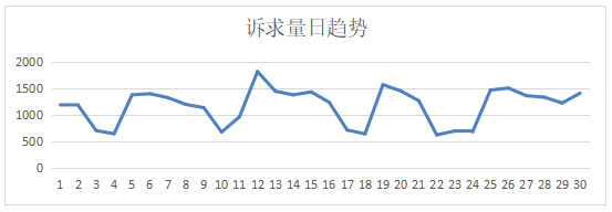 (一)从时间分布看,节假日诉求量较少,每天总量在600-700件,工作日每天在1100-1500件,除开6月11日晚上至12日因暴雨导致停电及房屋漏水诉求量上涨,总体趋势比较平稳。