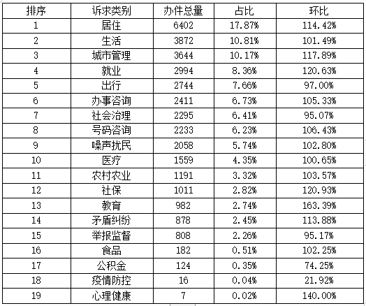 (二)本月诉求按大类统计,群众诉求主要集中在居住、生活、城市管理、就业、出行、办事咨询、社会治理、号码咨询、噪声扰民、医疗,以上十类占总比85.29%。