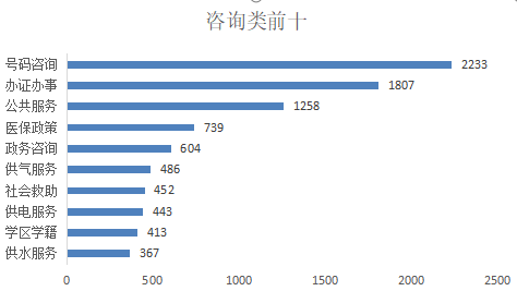 (四)本月群众诉求咨询类问题(中类)主要集中在:号码咨询、办事办证、公共服务、医保政策、政务咨询、供气服务、社会救助、供电服务、学区学籍咨询、供水服务等。