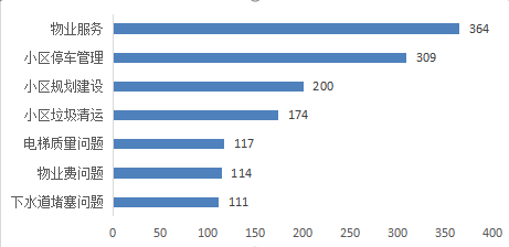小区管理类诉求1993件,占比5.56%,环比下降6.56%。其中物业服务364件,占比18.26%;小区停车管理309件,占比15.5%;小区规划建设200件,占比10.04%;小区垃圾清运问题174件,占比8.73%;电梯质量问题117件,占比5.87%;物业费问题114件,占比5.72%;下水道堵塞问题111件,占比5.57%。