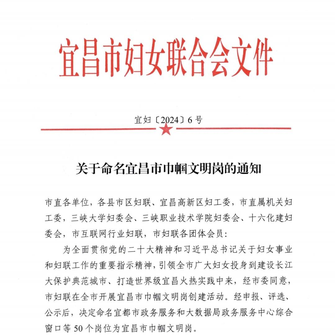 打印长阳政务服务中心企业登记联办窗口继获得“奔牛奖(集体)”、优化营商环境先进集体、“最佳单位”表彰后,在三八妇女节来临之际,又被宜昌市妇联命名为“宜昌市巾帼文明岗”。