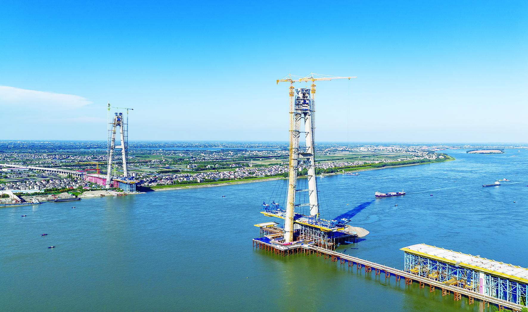 The main bridge is 1,549 meters long with a main span of 890 meters, making it the world’s longest-span steel-UHPC composite cable-stayed bridge currently under construction. (Reporters/Fu Jiangshan and Liu Kun, Correspondents/Li Qin and Feng Xinyi)
