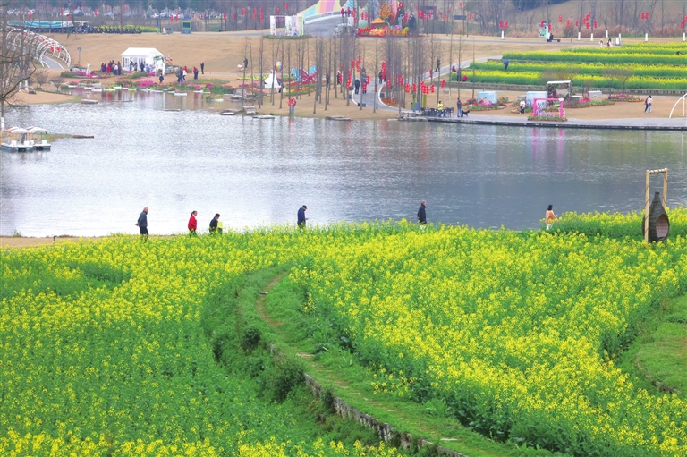 On March 2, rapeseed flowers were in full bloom at Juanqiao River Wetland Park, where the blossoms and visitors together created a vibrant spring scene, as beautiful as a painting.(Sanxia Daily: Reporter/Wu Yanling)