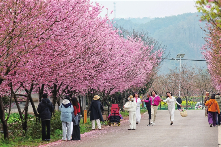On March 3, Yangjinfan Village in Zhicheng Town, Yidu County, welcomed visitors eager to see its cherry blossoms. All 4,800 trees were in full bloom, drawing crowds for spring outings and photo opportunities. (Sanxia Daily: Reporter/Huang Xiang)