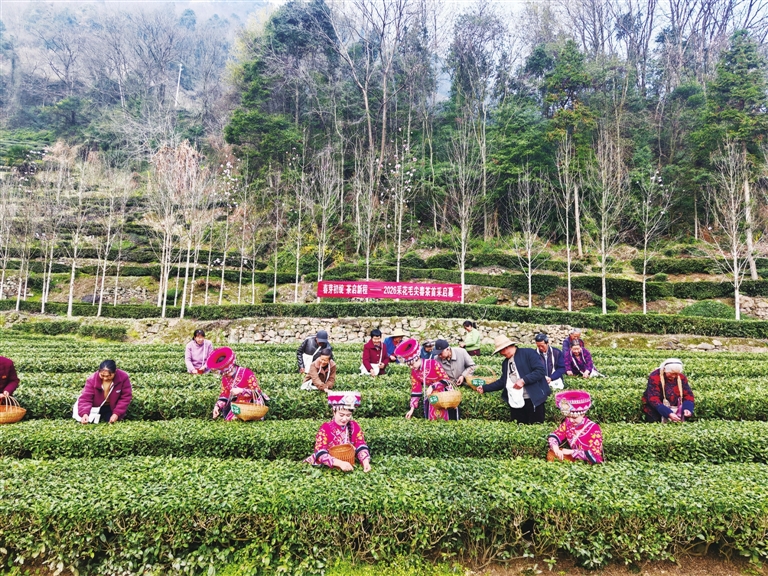 In recent days, as temperatures rise gradually, nearly one million mu of tea plantations across Yichang have begun their harvest of spring tea leaves, with fresh spring tea products being transported to various parts of the country. (Sanxia Daily: Reporter/Jie Xingwei, Correspondent/Zhang Shiguang)