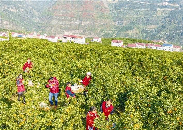 On December 14, villagers of Yesangping Village, Shuitianba Township, Zigui County picked navel oranges in the field. It is the season when the oranges come into the market with a bumper harvest in winter. The local villagers took advantage of the sunny days to harvest, transport and package them and supply them to the market through various channels. Zigui is a famous hometown of navel oranges. There are fresh oranges on the market all the year round. More than 66,000 acres of navel oranges are planted in the county, with an annual output of 800,000 tons and a gross output value of 10 billion yuan. The orange industry has become an important pillar industry for the county’s fruit farmers to increase their income and promote rural revitalization. (Photo by Correspondent Zheng Jiayu)