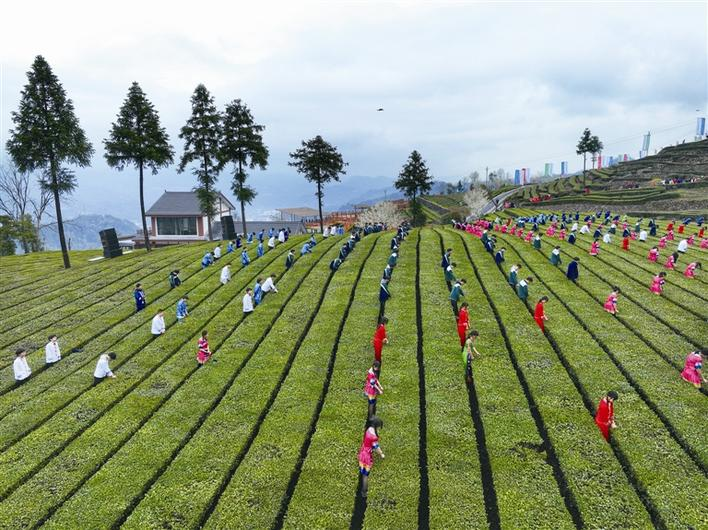March 17 saw the 2023 spring tea opening festival of Wufeng Tujia Autonomous County in the ecological tea garden of 800 hectares in Qinggangling, Yuyangguan town. The festival attracted tea merchants and tourists from all over the country to pick fresh tea and appreciate the scenery. 8 tea enterprises and buyers who came from Hunan province, Wuhan city and other places at the opening ceremony signed the purchase and sales contract with 8 Wufeng tea enterprises about “jointly building a happy tea town”, reaching an agreement on the purchase of 1,876,500 kilograms Wufeng tea, with the amount of 83.3 million yuan. (Photo by reporter/Song Yujie, correspondent/Chen Liang)