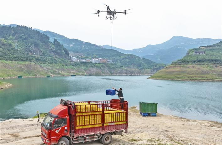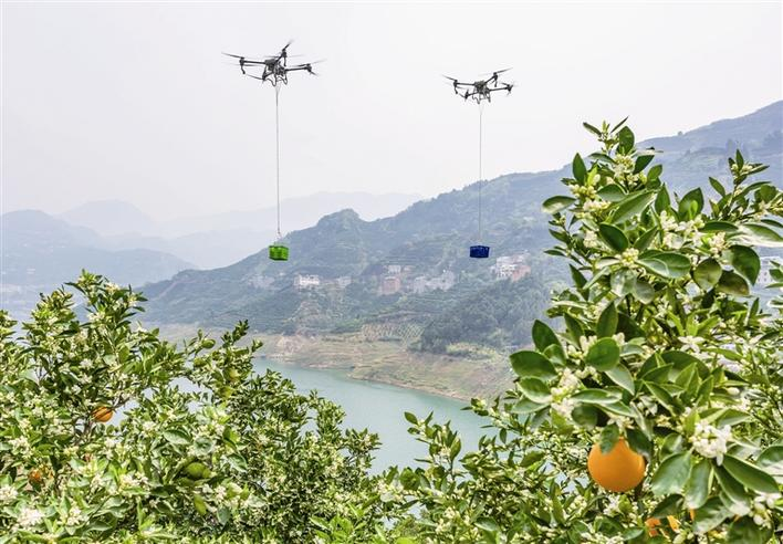 Villagers in Leigutai Village, Guojiaba Town, Zigui County transited the newly harvested navel oranges with UAVs on April 11. In Zigui County, where mountain regions host a large proportion, the villagers mainly depended on labor to transfer the navel oranges from orchards to the main roads. To reduce labor costs and improve efficiency, UAV technology has been introduced and technical training has been provided in Zigui County to explore the utilization of UAVs for the transport of navel oranges and fertilizers this year. (Xinhua/Zheng Jiayu)