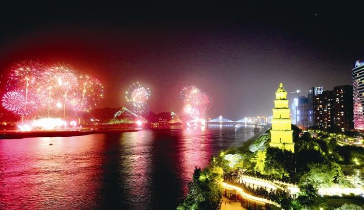 On the evening of April 30th, a fireworks and drones show with the theme of “Significant Gorges and Picturesque Yichang” was held to celebrate May Day on the two banks of the Yangtze River, presenting a wonderful visual feast for natives and visitors. (Photo by Reporter/Wang Changming)