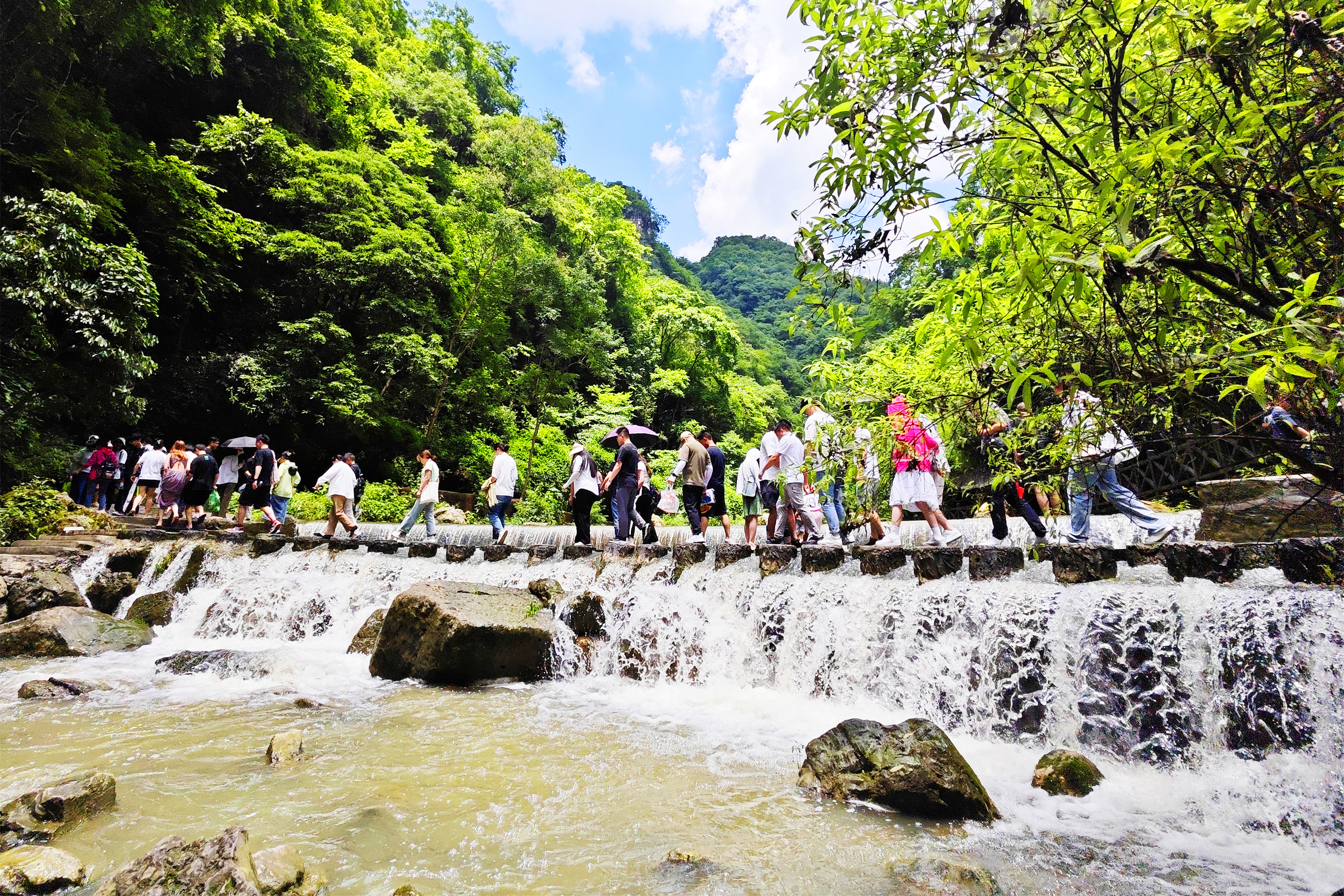 Tourists visited Three Gorges Grand Waterfalls in Yiling District on June 23, the second day of the Dragon Boat Festival holiday, fully amazed by the rainbows, the canyons, the mountains and waters, and the exhibited objects of intangible cultural heritage in the scenic spot. (Photo by Correspondents/Zhang Guorong & Mao Yuekang)