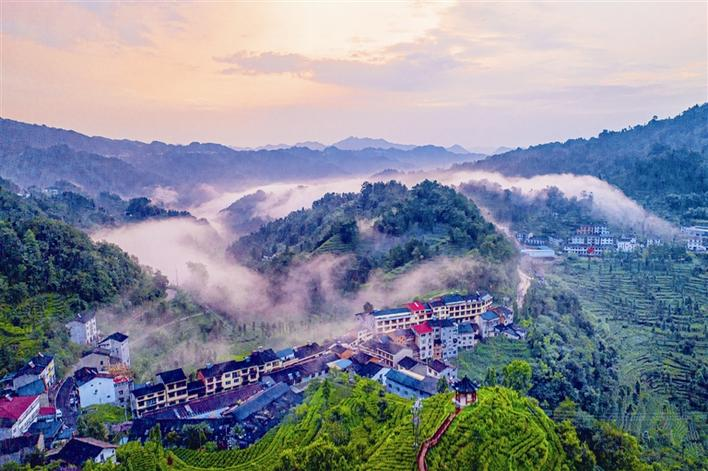 On August 8, the day of Liqiu (the beginning of autumn in the Chinese solar calendar), following a refreshing rain, Zhulinwan village in Dengcun township, Yiling district, presents a series of picturesque scenes of the mystical high mountains among drifting clouds. In the early morning, the dwellings and tea gardens illuminated by the sun nestle within the swirling mist and clouds while the tea bushes follow the contours of the mountains, creating an enchanting landscape of the tea township. (Correspondent/Zhang Guorong, Photographer/Wan Zuoxin)