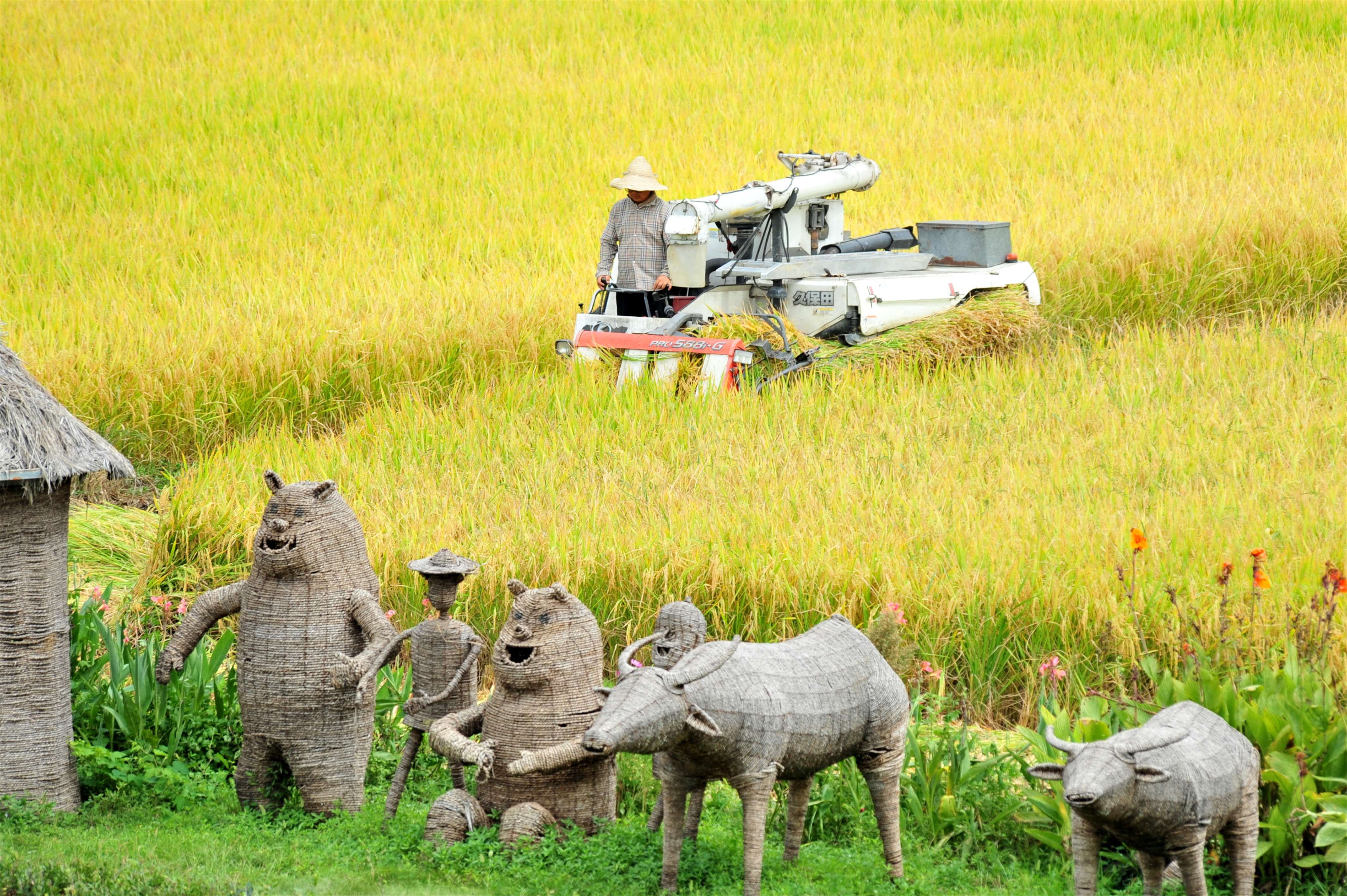 Photo ①: A harvester is busy harvesting rice in the golden fields of the demonstration site of agriculture and tourism integration at Nanya village in Fenxiang township, Yiling district on September 6.