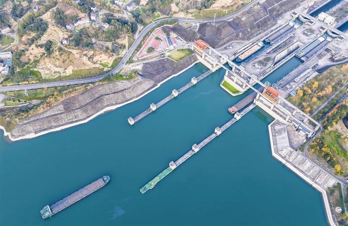 On Nov. 24, ships and cargo vessels passed through the Three Gorges double-way five-tier ship locks in order (drone photo). As of 6:00 p.m. on Nov. 23, the total cargo throughput via the Three Gorges ship locks reached 160 million tons, surpassing the highest level in history. The ship locks operated 10,148 times with a throughput volume of 156 million tons, and the ship lifts operated 4,187 times with a throughput volume of 4.3789 million tons. (Photo by Xinhua/Zheng Jiayu)