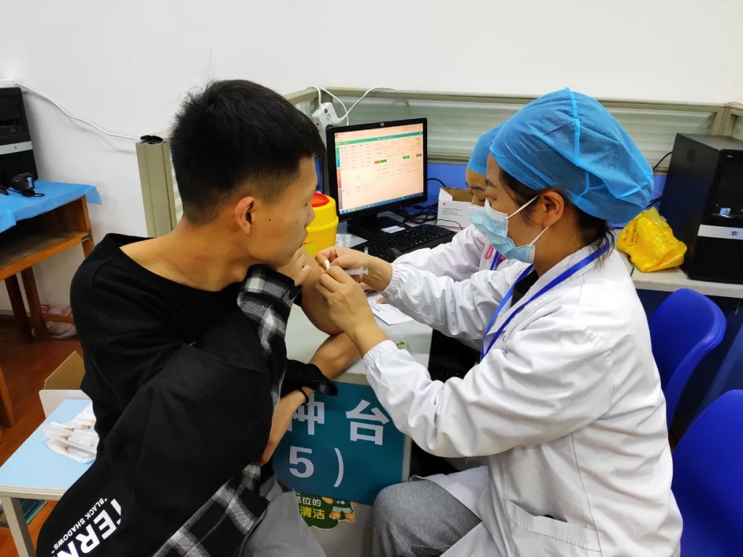 4月17日8时许,首批重组新冠病毒疫苗(CHO细胞)在湖北三峡职业技术学院临时接种点、伍家岗区市民活动中心方舱接种点开打。