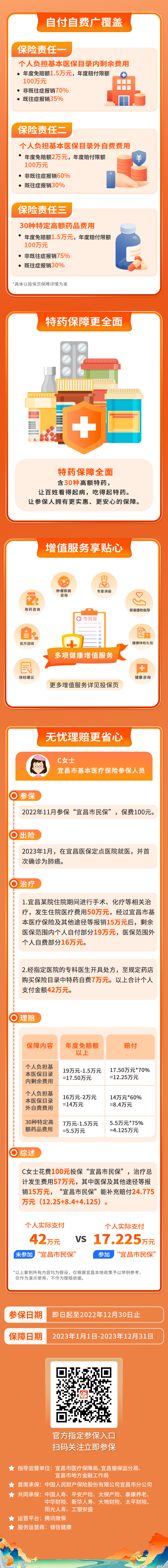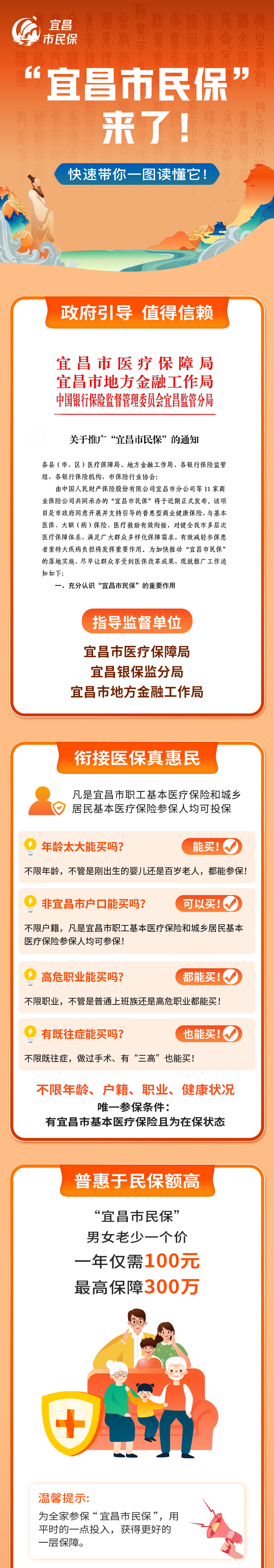 答:“宜昌市民保”保费一年100元,共涵盖3大保障责任: