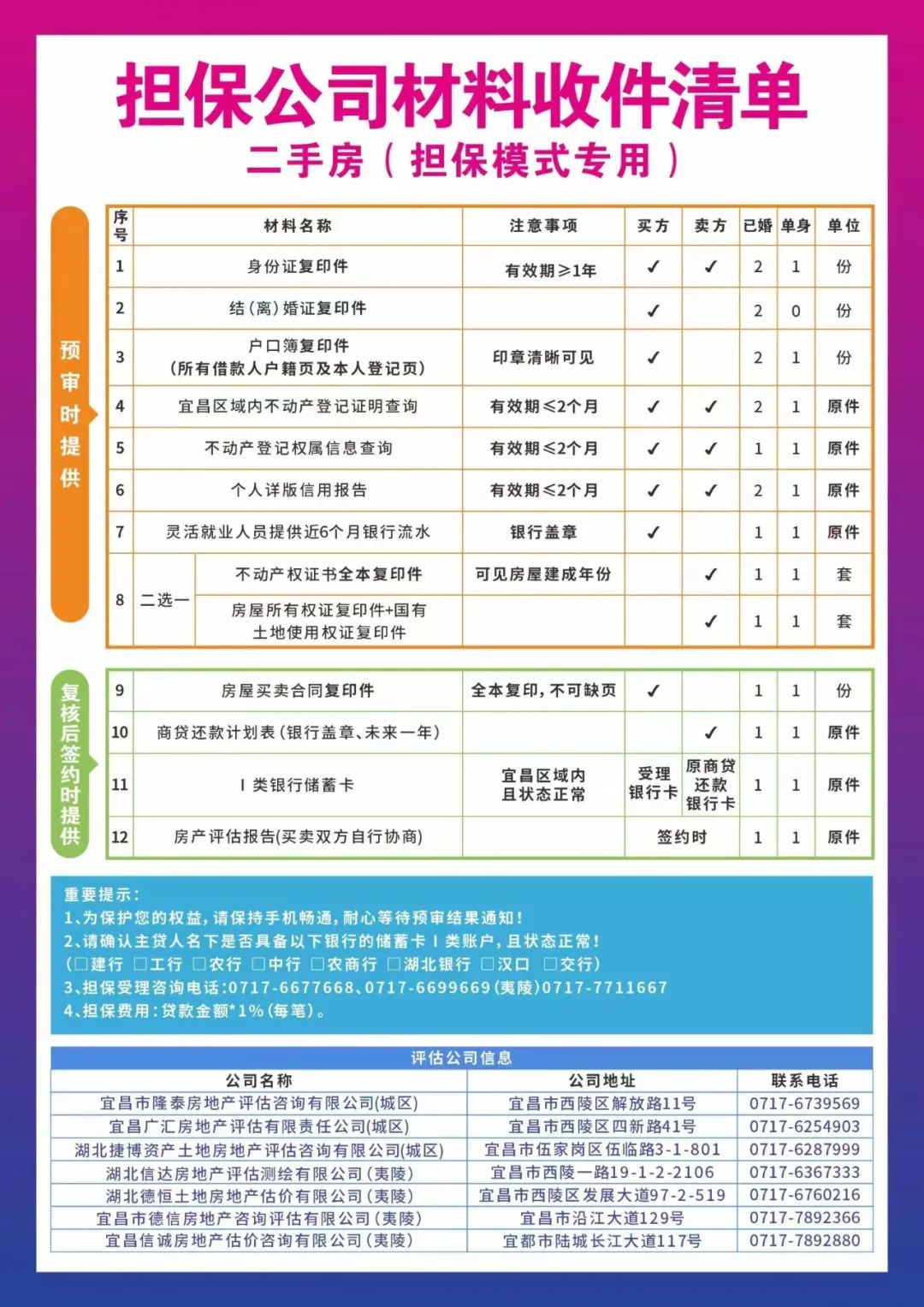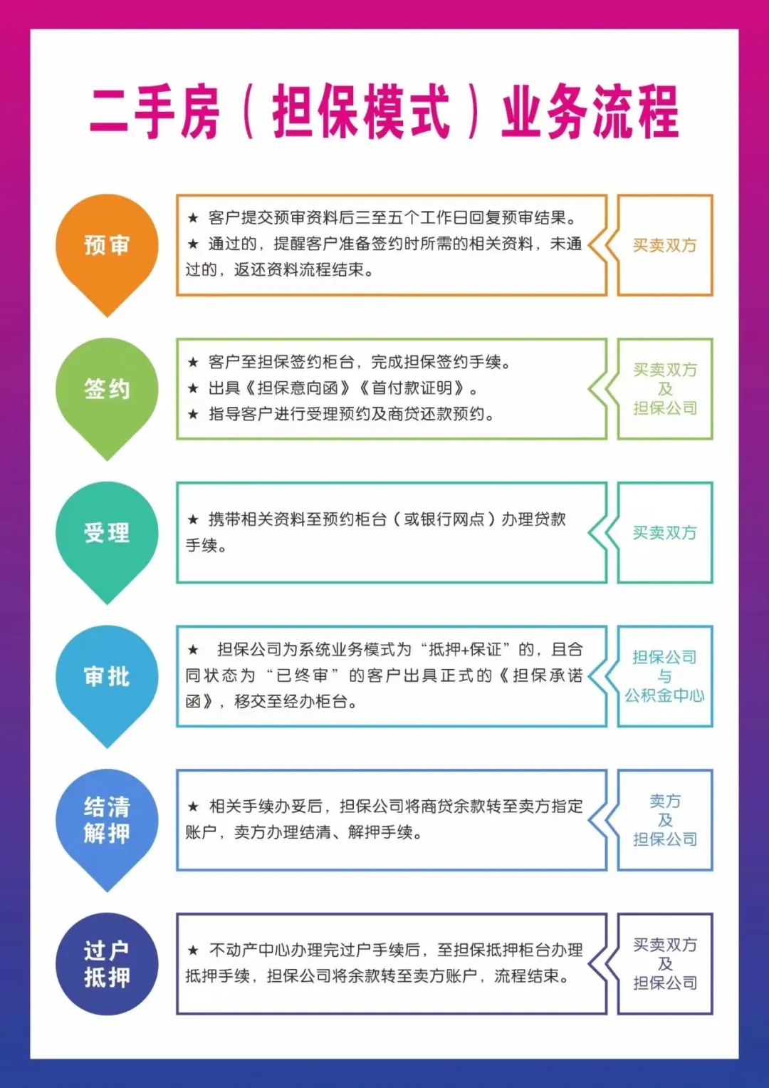 小贴士:二手房公积金贷款的担保模式需要先到与公积金中心合作的担保公司预审、签约,为了让大家少跑路,小编已贴心的将担保公司的业务流程和需要的材料附上: