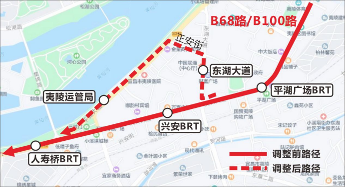 B68路、B100路往峡州路方向,取消停靠兴安BRT站,改绕东湖大道、正安街、平湖大道,临时增加停靠东湖大道站、夷陵运管局站。往夷陵客运站方向线路保持不变。