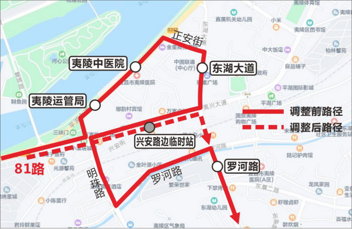 81路往东湖初中方向,取消夷陵运管局站、夷陵中医院站、东湖大道站,改绕夷兴大道、东湖大道,临时增加兴安路边临时站。往长江市场服装城方向线路保持不变。