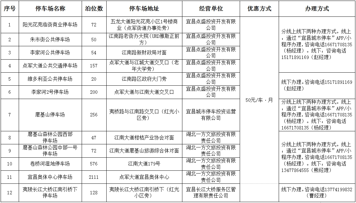 点军区主要公交站附近由市、区国有停车运营企业经营的公共停车场(详见附表)。