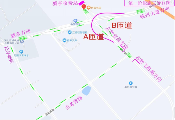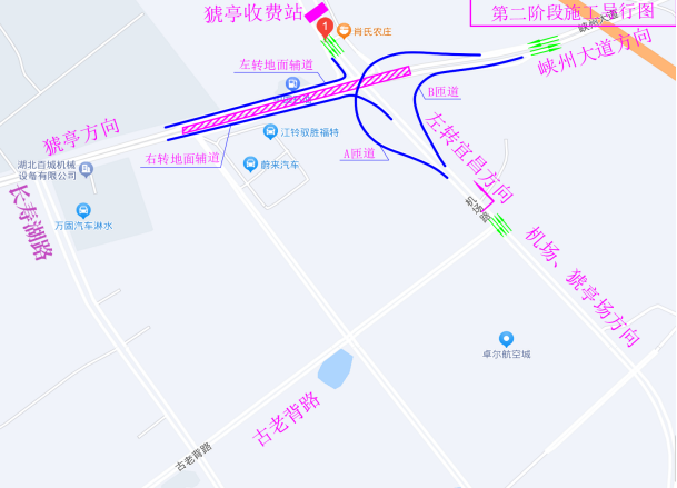 第一阶段:猇亭区先锋路(机场路-峡州大道段)A匝道全封闭施工,禁止车辆通行。