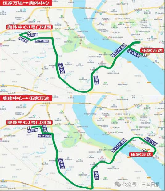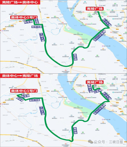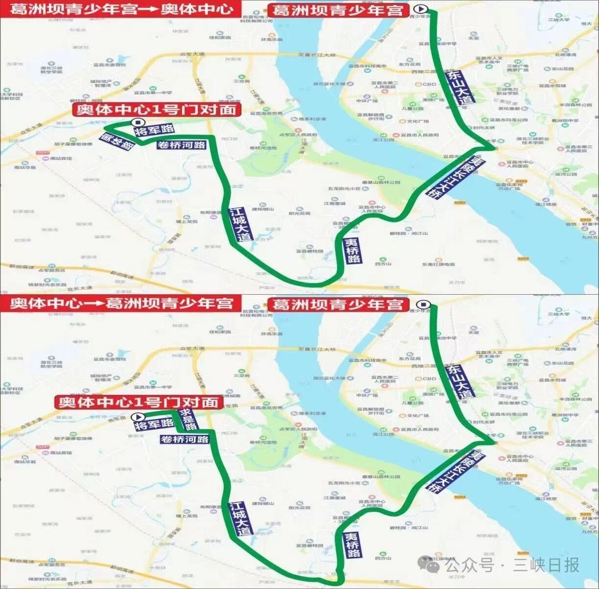 当日16:00开始从夷陵广场发车,经东山大道、夷陵长江大桥、江城大道到奥体中心。活动结束后,经江城大道、夷陵长江大桥、东山大道返回夷陵广场。