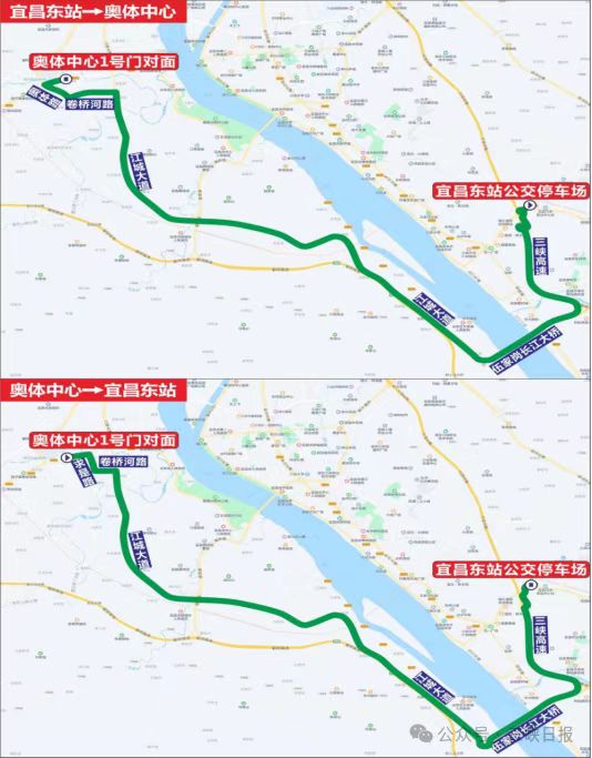 当日16:00开始从宜昌东站公交停车场发车,经伍家岗长江大桥、江城大道到奥体中心。活动结束后,经江城大道、伍家岗长江大桥返回宜昌东站公交停车场。