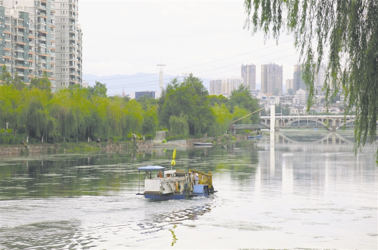 日前,工作人员在夷陵区黄柏河清理漂浮垃圾和水草,以保护水质。 (记者 黄余洋 摄)