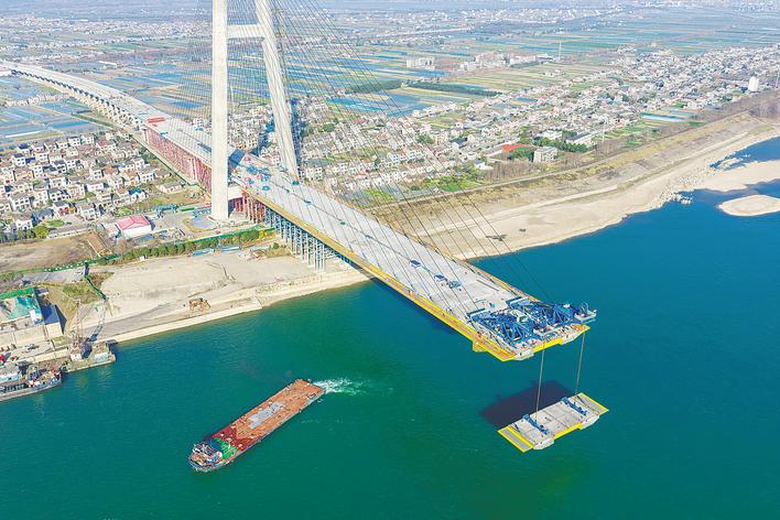 江面上,枝江长江大桥拔节生长。湖北日报全媒记者用手指远观比画,距离合龙好像就差“几厘米”。今年内,大桥将建成通车。