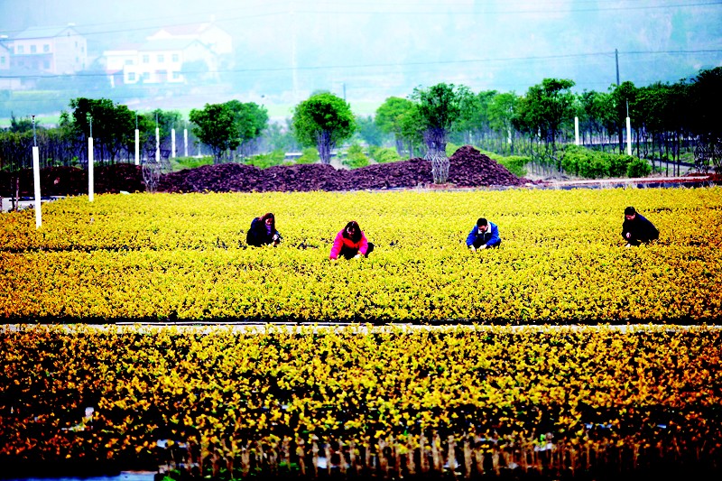 2月12日,在夷陵区龙泉镇一大型花卉苗木基地里,园艺人员正忙着养护8万多株金森女贞苗。开春以来,当地各个花卉苗木基地一派忙碌景象,多种作物长势喜人、生机勃勃,市场行情看好。花卉苗木已成为带动农民增收致富的新兴产业。 记者 黄翔 通讯员 曹文乾 摄