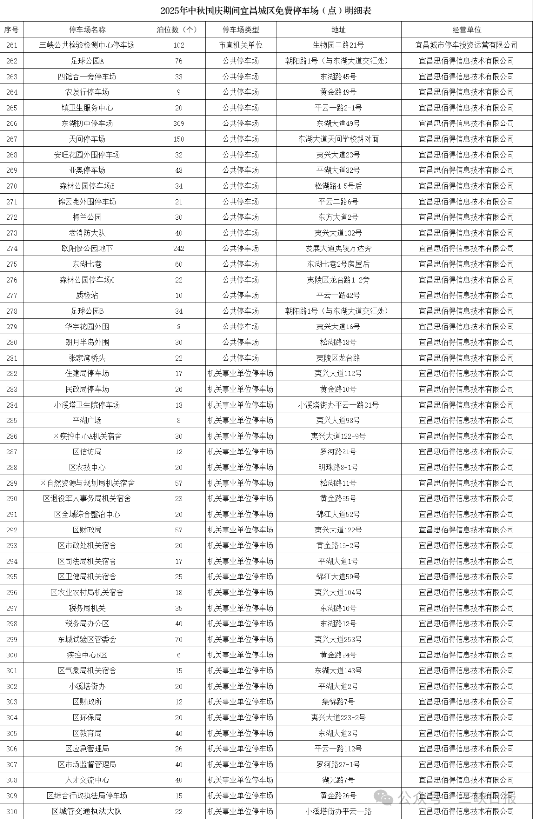 宜昌城发集团自营公共停车场及道路临时停车泊位、部分县市区属国有停车运营企业负责经营管理的公共停车场、具备条件的机关事业单位内部停车场,全市共501个停车场(点)、42264个泊位免费停放,其中城区有310个停车场(点)、20871个泊位。