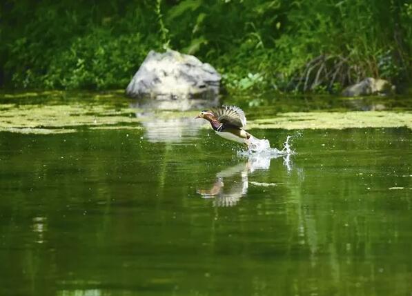 5月7日,一只野生鸳鸯在黄柏河里戏水,鸳鸯对水质等环境要求极高,能在此安家,和黄柏河生态环境的改善有很大关系。(李风 摄)