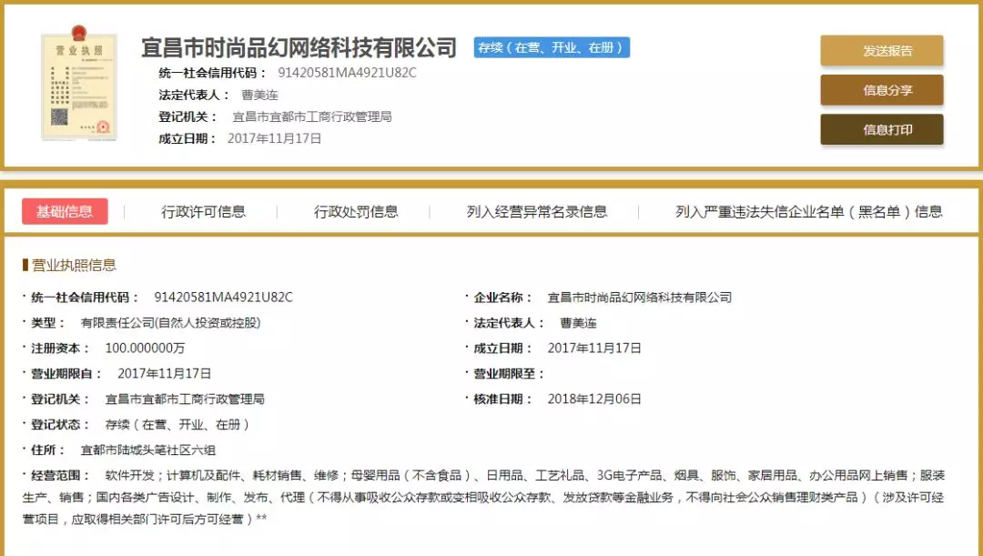 3.企业名称:宜昌时尚品幼网络科技有限公司(2018年12月变更为宜昌时尚品幻网络科技有限公司)