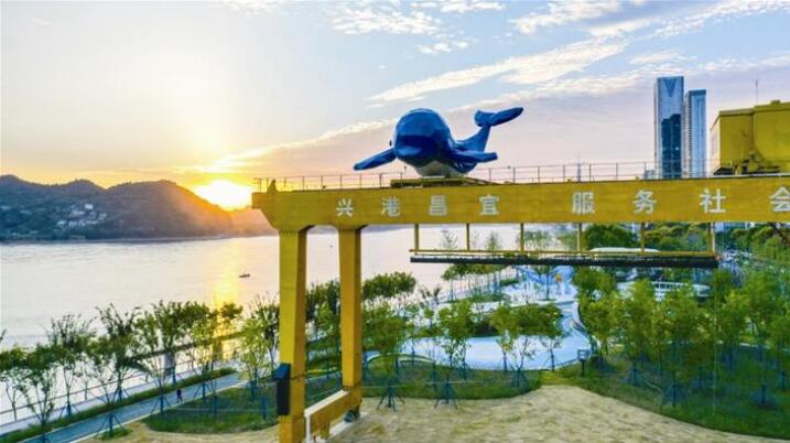 图为滨江功能区一条重达6吨的卡通江豚塑像“飞跃”在龙门吊车塔架上。三峡日报全媒记者 吴延陵 摄