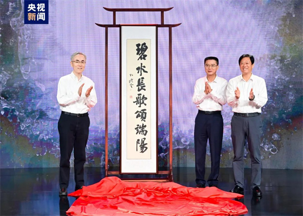 中央广播电视总台副台长王晓真与湖北省委宣传部副部长陶宏家、宜昌市委书记熊征宇共同揭晓由中国书法家协会主席孙晓云题写的片名——“碧水长歌颂端阳”