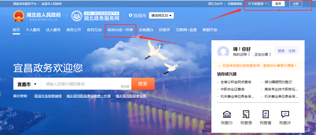 1.打开湖北政务服务网(http://zwfw.hubei.gov.cn/),找到注册登录,填写信息进行法人注册并登录。登录后,在首页选择【高效办成一件事】专栏,点击进入。