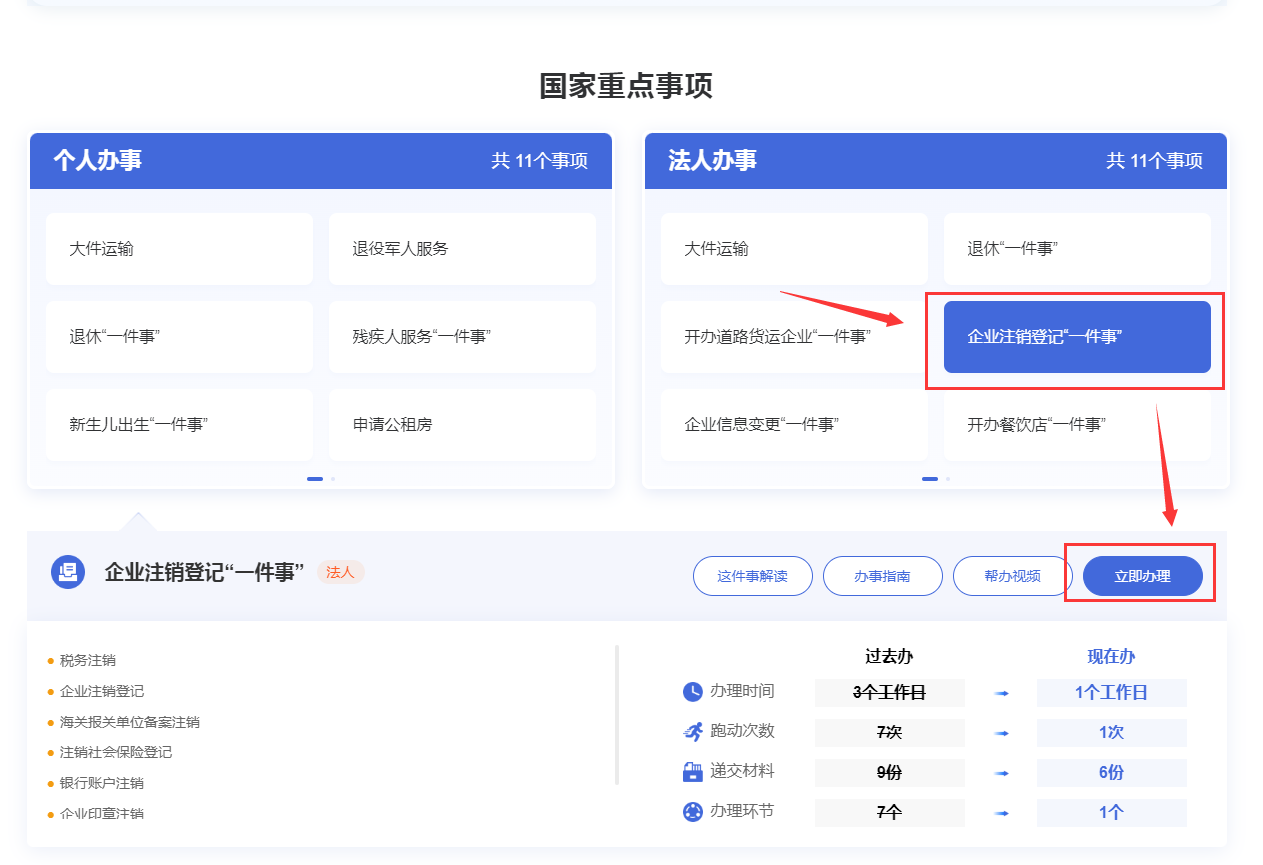 2.在国家重点事项板块找到开办【企业注销登记“一件事”】,点击进入然后点击【立即办理】。