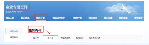 5.如何查询办件进度。办理人员提交完成企业注销登记“一件事”主题申报信息后,可通过个人专属空间(用户空间)查看办件进度情况。点击【我的办事】,查看【联办件】,根据“申请时间”、“办件编码”、“审批事项”查看办件进度。