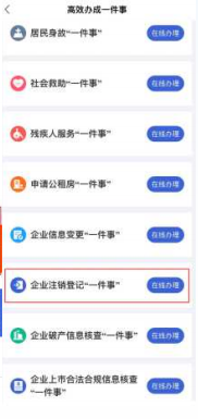 1.打开鄂汇办APP,找到【我的】—点击【登录】(填写信息进行法人信息注册并登录)—点击【首页】—进入【服务专区】—选择【高效办成一件事】—选择【企业注销登记“一件事”】—点击【在线办理】。