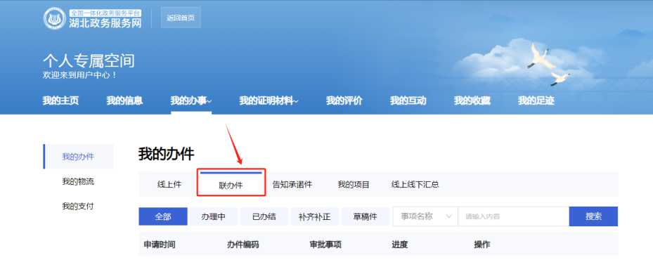 ⑤办理人员提交完成残疾人服务“一件事”主题申报信息后,可通过个人专属空间(用户空间)查看办件进度情况。点击“我的办事”,查看“联办件”,根据“申请时间”、“办件编码”、“审批事项”查看办件进度。