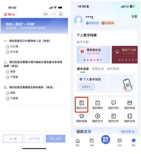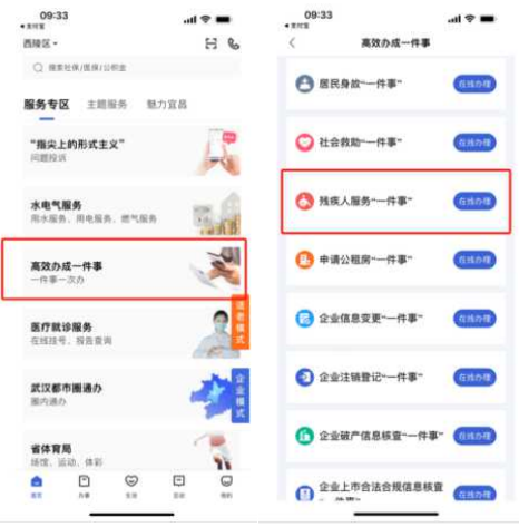 ②在APP首页服务专区中选择“高效办成一件事”专栏找到残疾人服务“一件事”主题点击“在线办理”进入主题。